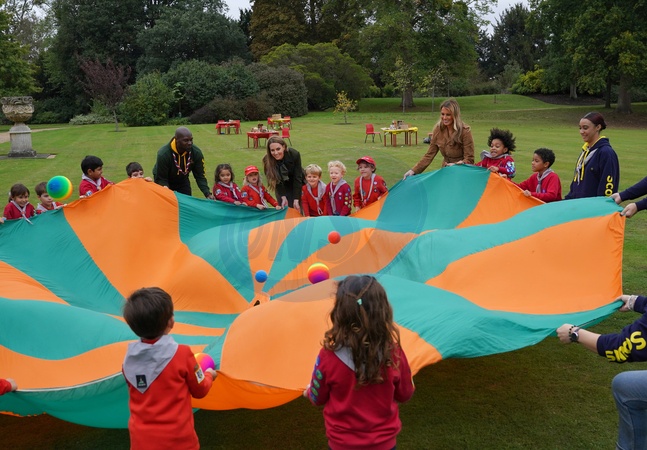 The Princess of Wales (centre) and First Lady Melania Trump (centre right) play a game as they meet members of the Scouts' Squirrels programme in Frogmore Gardens in Windsor, Berkshire, on day two of US President Donald Trump's second state visit to the UK. The princess and the US first lady joined 20 Squirrel Scouts taking part in nature activities on the Windsor Castle estate to earn their Go Wild badges. Picture date: Thursday September 18, 2025., Credit:Yui Mok / Avalon
