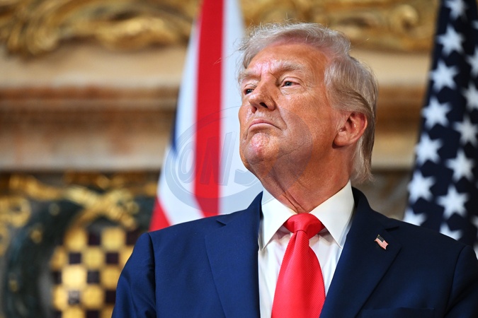 AYLESBURY, ENGLAND - SEPTEMBER 18: U.S. President Donald Trump attends a press conference with UK Prime Minister Keir Starmer (not pictured) at Chequers at the conclusion of a state visit on September 18, 2025 in Aylesbury, England. This is the final day of President Trump's second UK state visit, with the previous one taking place in 2019 during his first presidential term., Credit:Leon Neal / Avalon