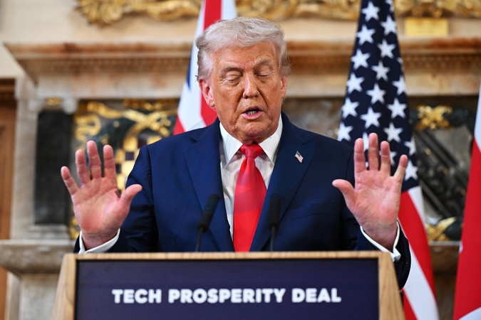 AYLESBURY, ENGLAND - SEPTEMBER 18: U.S. President Donald Trump talks at a press conference with UK Prime Minister Keir Starmer (not pictured) at Chequers at the conclusion of a state visit on September 18, 2025 in Aylesbury, England. This is the final day of President Trump's second UK state visit, with the previous one taking place in 2019 during his first presidential term., Credit:Leon Neal / Avalon