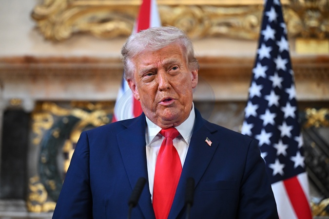 AYLESBURY, ENGLAND - SEPTEMBER 18: U.S. President Donald Trump talks at a press conference with UK Prime Minister Keir Starmer (not pictured) at Chequers at the conclusion of a state visit on September 18, 2025 in Aylesbury, England. This is the final day of President Trump's second UK state visit, with the previous one taking place in 2019 during his first presidential term., Credit:Leon Neal / Avalon