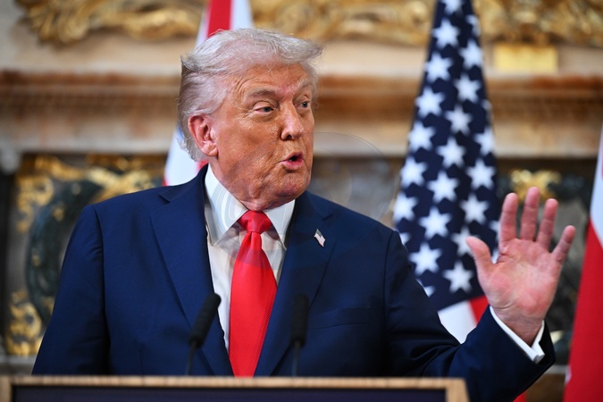 AYLESBURY, ENGLAND - SEPTEMBER 18: U.S. President Donald Trump talks at a press conference with UK Prime Minister Keir Starmer (not pictured) at Chequers at the conclusion of a state visit on September 18, 2025 in Aylesbury, England. This is the final day of President Trump's second UK state visit, with the previous one taking place in 2019 during his first presidential term., Credit:Leon Neal / Avalon