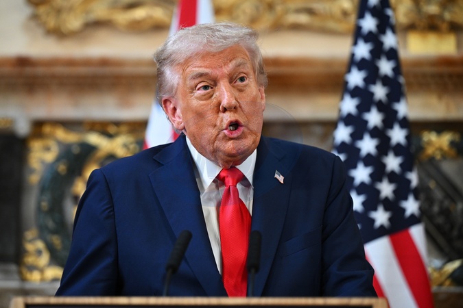 AYLESBURY, ENGLAND - SEPTEMBER 18: U.S. President Donald Trump talks at a press conference with UK Prime Minister Keir Starmer (not pictured) at Chequers at the conclusion of a state visit on September 18, 2025 in Aylesbury, England. This is the final day of President Trump's second UK state visit, with the previous one taking place in 2019 during his first presidential term., Credit:Leon Neal / Avalon