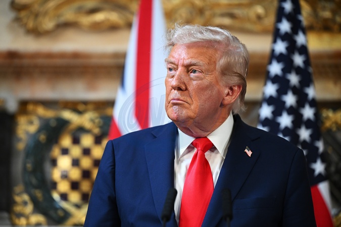 AYLESBURY, ENGLAND - SEPTEMBER 18: U.S. President Donald Trump attends a press conference with UK Prime Minister Keir Starmer (not pictured) at Chequers at the conclusion of a state visit on September 18, 2025 in Aylesbury, England. This is the final day of President Trump's second UK state visit, with the previous one taking place in 2019 during his first presidential term., Credit:Leon Neal / Avalon