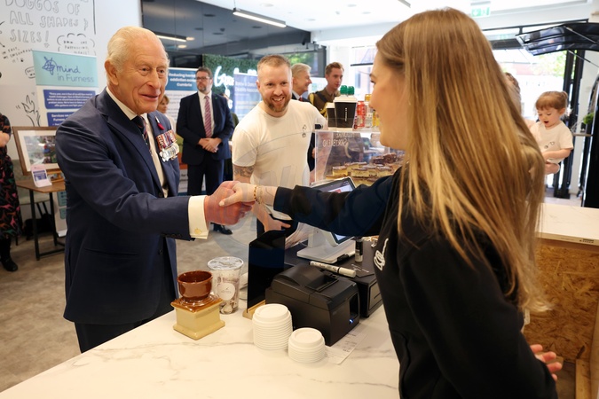 BARROW-IN-FURNESS, ENGLAND - SEPTEMBER 22: King Charles III visits Coffee D'Ash in the Portland Walk regeneration area on September 22, 2025 in Barrow-in-Furness, England., Credit:Chris Jackson / Avalon