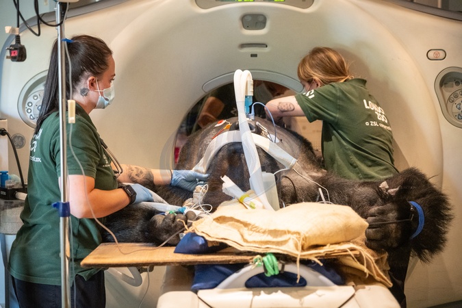 Silverback gorilla Kiburi, the 21-year-old patriarch of London Zoo's western lowland gorilla troop, was given an initial clean bill of health this week – following a mighty trip to the vets for a full health check. The 177kg primate had been under observation after contending with recurrent gastrointestinal issues, leading the Zoo's expert veterinary team to decide that they needed to take a closer look at him, with the help of a CT scan and both veterinary and human health specialists. Before his full health check could take place, Kiburi had to be anaesthetised – which was done with an injection in his upper arm. This seemingly simple procedure took months of planning to achieve, with Kiburi taking part in frequent training with zookeepers and veterinary nurses, so that he would offer his arm for the anaesthetic to be administered. Once anaesthetised, Kiburi was first given a full cardiology examination in the back dens of his Gorilla Kingdom habitat with London Zoo's vets supported by cardiologists from the Royal Veterinary College. Monitoring heart health for any animal is important, and provides the opportunity to assess their overall wellbeing. Once this was completed, it was time to get Kiburi to the CT truck. It took six people to heave the ape onto a gurney, before he had to be driven on a five-minute journey through the zoo on a flatbed truck to the CT scanner, surrounded by vets and nurses monitoring him the whole way. The CT scanner – a huge piece of machinery – had to be hired in, with Burgess Diagnostics Mobile CT Service wheeling their 44-feet long truck into the Zoo's grounds, ready for Kiburi's check-up. The scan, which was focussed on Kiburi's abdomen, revealed no obvious cause for concern, a diagnosis supported by doctors from the NHS who specialise in gastrointestinal health and imaging, and provided unique assistance for Kiburi's procedure., Credit:ZSL London Zoo / Avalon