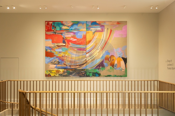 Rachel Jones (b.1991) STRUCK (2025), oil sticks and oil pastel on linen, courtesy of the artist. The Courtauld Gallery today unveiled two new site-specific commissions by acclaimed artist Rachel Jones. The new paintings, titled STRUCK, are on view in The John Browne Entrance Hall and the adjacent Ticketing Hall.The large-scale, brightly coloured abstract works were created especially for The Courtauld Gallery. They are intended to playfully disrupt the formality of the grand 18th century neoclassical building, based in the North Wing of Somerset House in central London, and to open conversations with paintings in the Gallery's collection., Credit:Fergus Carmichael/The Courtauld / Avalon