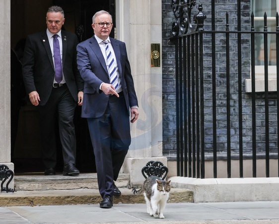 Larry the cat escorts out Prime Minister of Australia, Anthony Albanese from 10 Downing Street, London, UK