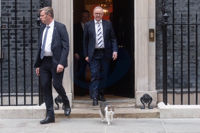 Anthony Albanese - Prime Minister of Australia departs a bilateral meeting with British Prime Minister Sir Keir Starmer with Larry The Cat photobombing him in Downing Street in London, England, UK on Friday 26 September, 2025., Credit:Justin Ng / Avalon