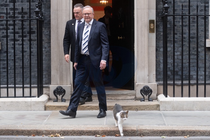 Anthony Albanese - Prime Minister of Australia departs a bilateral meeting with British Prime Minister Sir Keir Starmer with Larry The Cat photobombing him in Downing Street in London, England, UK on Friday 26 September, 2025., Credit:Justin Ng / Avalon