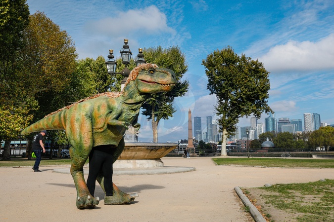 London, UK, 27th Sep 2025. A T-Rex roaming the grounds. Iconic screen characters take over the Old Rotal Nanal College grounds, Painted Hall and courtyards, in a Film100 cinematic celebration and Guinness World Record attempt for the largest number of people dressed as TV and film characters gathered. The marks 100 years of filmmaking on-site for the Old Royal Naval College and Elstree Studios., Credit:Imageplotter / Avalon