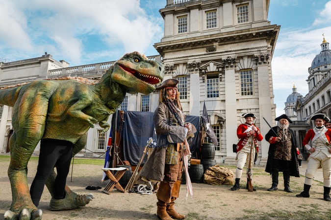 London, UK, 27th Sep 2025. A T-Rex roaming the grounds meets Pirate of the Caribbean Jack Sparrow and historic navy soldiers. Iconic screen characters take over the Old Rotal Nanal College grounds, Painted Hall and courtyards, in a Film100 cinematic celebration and Guinness World Record attempt for the largest number of people dressed as TV and film characters gathered. The marks 100 years of filmmaking on-site for the Old Royal Naval College and Elstree Studios., Credit:Imageplotter / Avalon