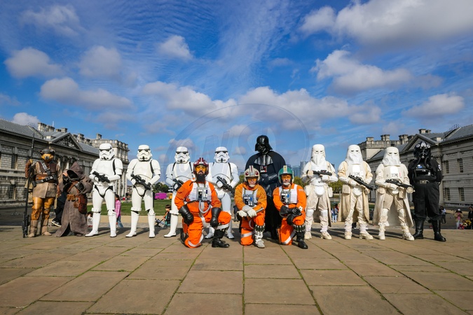 London, UK, 27th Sep 2025. Star Wars characters pose in the iconic surroundings. Iconic screen characters take over the Old Rotal Nanal College grounds, Painted Hall and courtyards, in a Film100 cinematic celebration and Guinness World Record attempt for the largest number of people dressed as TV and film characters gathered. The marks 100 years of filmmaking on-site for the Old Royal Naval College and Elstree Studios., Credit:Imageplotter / Avalon