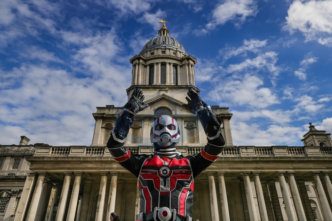 London, UK, 27th Sep 2025. Ant Man looks impressive in front of the ORNC Chapel. Iconic screen characters take over the Old Rotal Nanal College grounds, Painted Hall and courtyards, in a Film100 cinematic celebration and Guinness World Record attempt for the largest number of people dressed as TV and film characters gathered. The marks 100 years of filmmaking on-site for the Old Royal Naval College and Elstree Studios., Credit:Imageplotter / Avalon