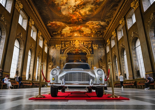 London, UK, 27th Sep 2025. An Aston Martin DB5 from the James Bond films in the beautiful Painted Hall. Iconic screen characters take over the Old Rotal Nanal College grounds, Painted Hall and courtyards, in a Film100 cinematic celebration and Guinness World Record attempt for the largest number of people dressed as TV and film characters gathered. The marks 100 years of filmmaking on-site for the Old Royal Naval College and Elstree Studios., Credit:Imageplotter / Avalon