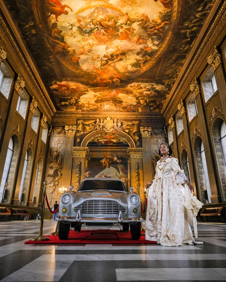 London, UK, 27th Sep 2025. Phaendra as Queen Charlotte from Bridgerton poses in the stunning Painted Hall with a James Bond Aston Martin. Iconic screen characters take over the Old Rotal Nanal College grounds, Painted Hall and courtyards, in a Film100 cinematic celebration and Guinness World Record attempt for the largest number of people dressed as TV and film characters gathered. The marks 100 years of filmmaking on-site for the Old Royal Naval College and Elstree Studios., Credit:Imageplotter / Avalon