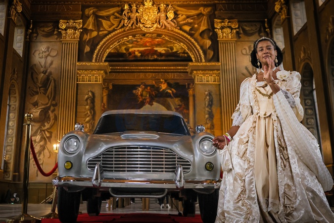 London, UK, 27th Sep 2025. Phaendra as Queen Charlotte from Bridgerton poses in the stunning Painted Hall with a James Bond Aston Martin. Iconic screen characters take over the Old Rotal Nanal College grounds, Painted Hall and courtyards, in a Film100 cinematic celebration and Guinness World Record attempt for the largest number of people dressed as TV and film characters gathered. The marks 100 years of filmmaking on-site for the Old Royal Naval College and Elstree Studios., Credit:Imageplotter / Avalon
