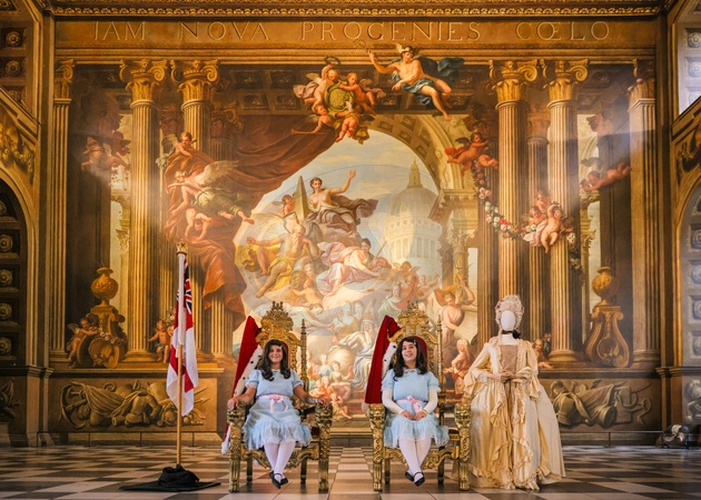 London, UK, 27th Sep 2025. The twins from 'The Shining' on the Bridgerton thrones in the beautiful Painted Hall. Iconic screen characters take over the Old Rotal Nanal College grounds, Painted Hall and courtyards, in a Film100 cinematic celebration and Guinness World Record attempt for the largest number of people dressed as TV and film characters gathered. The marks 100 years of filmmaking on-site for the Old Royal Naval College and Elstree Studios., Credit:Imageplotter / Avalon