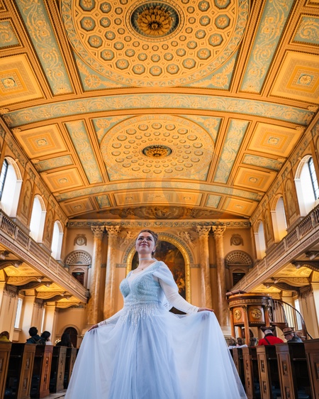 London, UK, 27th Sep 2025. A young lady dressed as Cinderella poses in the beautiful ORNC Chapel. Iconic screen characters take over the Old Rotal Nanal College grounds, Painted Hall and courtyards, in a Film100 cinematic celebration and Guinness World Record attempt for the largest number of people dressed as TV and film characters gathered. The marks 100 years of filmmaking on-site for the Old Royal Naval College and Elstree Studios., Credit:Imageplotter / Avalon