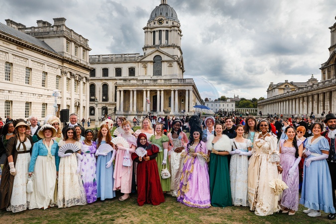 London, UK, 27th Sep 2025. A large group of Bridgerton participants. Participants celebrate and pose as a Guinness World Record was officially achieved with 874 characters attending the event. Iconic screen characters take over the Old Rotal Nanal College grounds, Painted Hall and courtyards, in a Film100 cinematic celebration and Guinness World Record attempt for the largest number of people dressed as TV and film characters gathered. The marks 100 years of filmmaking on-site for the Old Royal Naval College and Elstree Studios., Credit:Imageplotter / Avalon