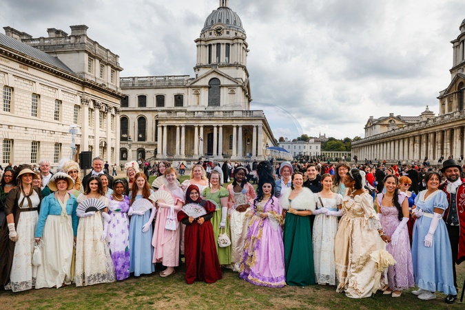 London, UK, 27th Sep 2025. A large group of Bridgerton participants. Participants celebrate and pose as a Guinness World Record was officially achieved with 874 characters attending the event. Iconic screen characters take over the Old Rotal Nanal College grounds, Painted Hall and courtyards, in a Film100 cinematic celebration and Guinness World Record attempt for the largest number of people dressed as TV and film characters gathered. The marks 100 years of filmmaking on-site for the Old Royal Naval College and Elstree Studios., Credit:Imageplotter / Avalon