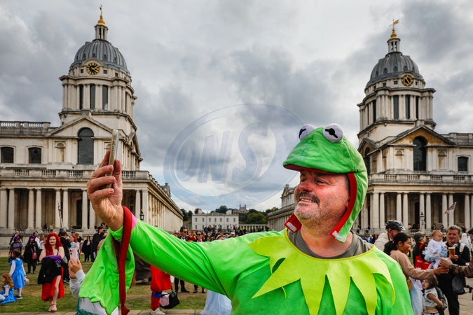 London, UK, 27th Sep 2025. A Kermit takes selfies. Participants celebrate and pose as a Guinness World Record was officially achieved with 874 characters attending the event. Iconic screen characters take over the Old Rotal Nanal College grounds, Painted Hall and courtyards, in a Film100 cinematic celebration and Guinness World Record attempt for the largest number of people dressed as TV and film characters gathered. The marks 100 years of filmmaking on-site for the Old Royal Naval College and Elstree Studios., Credit:Imageplotter / Avalon