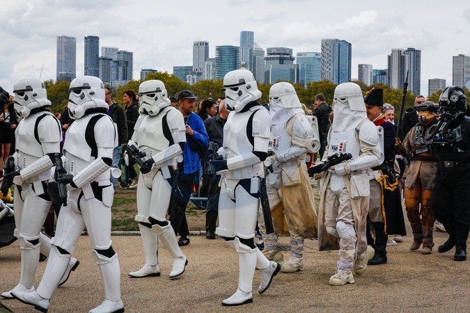London, UK, 27th Sep 2025.Stormtroopers march around the site. Participants celebrate and pose as a Guinness World Record was officially achieved with 874 characters attending the event. Iconic screen characters take over the Old Rotal Nanal College grounds, Painted Hall and courtyards, in a Film100 cinematic celebration and Guinness World Record attempt for the largest number of people dressed as TV and film characters gathered. The marks 100 years of filmmaking on-site for the Old Royal Naval College and Elstree Studios., Credit:Imageplotter / Avalon