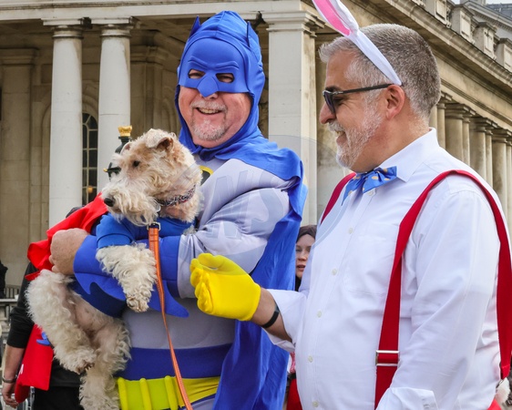 London, UK, 27th Sep 2025. Two participants with 'Superdog'. Participants celebrate and pose as a Guinness World Record was officially achieved with 874 characters attending the event. Iconic screen characters take over the Old Rotal Nanal College grounds, Painted Hall and courtyards, in a Film100 cinematic celebration and Guinness World Record attempt for the largest number of people dressed as TV and film characters gathered. The marks 100 years of filmmaking on-site for the Old Royal Naval College and Elstree Studios., Credit:Imageplotter / Avalon