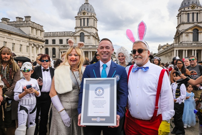 London, UK, 27th Sep 2025. The official record certificate is presented. Participants celebrate and pose as a Guinness World Record was officially achieved with 874 characters attending the event. Iconic screen characters take over the Old Rotal Nanal College grounds, Painted Hall and courtyards, in a Film100 cinematic celebration and Guinness World Record attempt for the largest number of people dressed as TV and film characters gathered. The marks 100 years of filmmaking on-site for the Old Royal Naval College and Elstree Studios., Credit:Imageplotter / Avalon