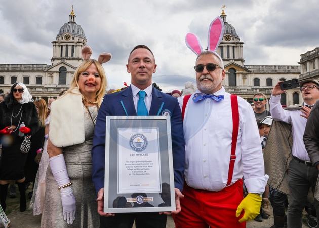 London, UK, 27th Sep 2025. The official record certificate is presented. Participants celebrate and pose as a Guinness World Record was officially achieved with 874 characters attending the event. Iconic screen characters take over the Old Rotal Nanal College grounds, Painted Hall and courtyards, in a Film100 cinematic celebration and Guinness World Record attempt for the largest number of people dressed as TV and film characters gathered. The marks 100 years of filmmaking on-site for the Old Royal Naval College and Elstree Studios., Credit:Imageplotter / Avalon