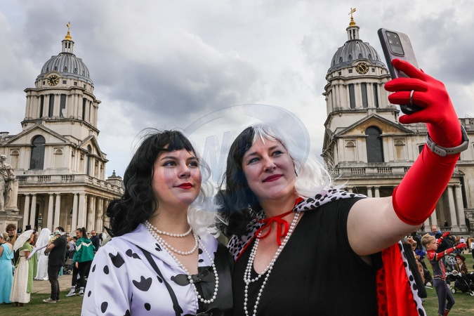 London, UK, 27th Sep 2025. Two Cruella de Villes take selfies. Participants celebrate and pose as a Guinness World Record was officially achieved with 874 characters attending the event. Iconic screen characters take over the Old Rotal Nanal College grounds, Painted Hall and courtyards, in a Film100 cinematic celebration and Guinness World Record attempt for the largest number of people dressed as TV and film characters gathered. The marks 100 years of filmmaking on-site for the Old Royal Naval College and Elstree Studios., Credit:Imageplotter / Avalon