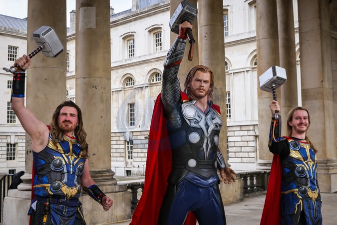 London, UK, 27th Sep 2025. Thor and Thor pose with Thor. Participants celebrate and pose as a Guinness World Record was officially achieved with 874 characters attending the event. Iconic screen characters take over the Old Rotal Nanal College grounds, Painted Hall and courtyards, in a Film100 cinematic celebration and Guinness World Record attempt for the largest number of people dressed as TV and film characters gathered. The marks 100 years of filmmaking on-site for the Old Royal Naval College and Elstree Studios., Credit:Imageplotter / Avalon