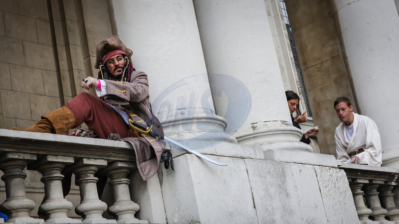 London, UK, 27th Sep 2025.Jack Sparrow takes a rest. Participants celebrate and pose as a Guinness World Record was officially achieved with 874 characters attending the event. Iconic screen characters take over the Old Rotal Nanal College grounds, Painted Hall and courtyards, in a Film100 cinematic celebration and Guinness World Record attempt for the largest number of people dressed as TV and film characters gathered. The marks 100 years of filmmaking on-site for the Old Royal Naval College and Elstree Studios., Credit:Imageplotter / Avalon