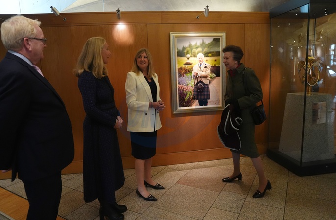 The Princess Royal unveils a new portrait of King Charles III, taken by photographer Millie Pilkington(C), alongside Jackson Carlaw MSP and Presiding Officer, the Rt Hon Alison Johnstone MSP during a visit to the Scottish Parliament at Holyrood, Edinburgh., Credit:Andrew Milligan / Avalon