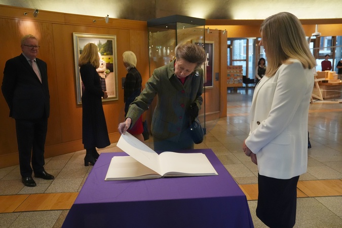 The Princess Royal signs the visitors book after unveiling a new portrait of King Charles III, taken by photographer Millie Pilkington, during a visit to the Scottish Parliament at Holyrood, Edinburgh., Credit:Andrew Milligan / Avalon