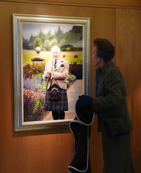 The Princess Royal unveils a new portrait of King Charles III, taken by photographer Millie Pilkington, during a visit to the Scottish Parliament at Holyrood, Edinburgh., Credit:Andrew Milligan / Avalon