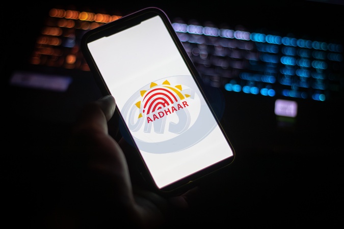 In this photo illustration, the Aadhaar logo is seen displayed on a mobile phone screen, Credit:Yousuf Sarfaraz / Avalon