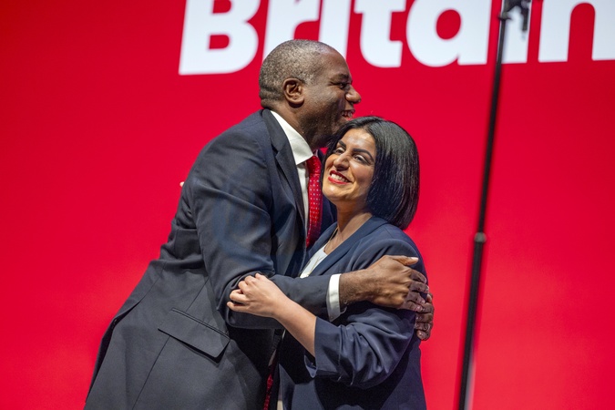 Liverpool, UK — 29 September 2025. Shabana Mahmood MP, Secretary of State for the Home Department, delivers her speech to delegates on Day 2 of the Labour Party Conference. Following her address, she shares a hug with Deputy Prime Minister David Lammy., Credit:Abdullah Bailey / Avalon