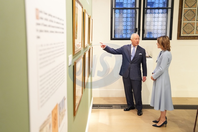 King Charles III with Aura Woodward, director of the Romanian Cultural Institute in London, during a visit to view the Queen Marie of Romania exhibition at the Garrison Chapel in London. Picture date: Monday September 29, 2025., Credit:Jordan Pettitt / Avalon
