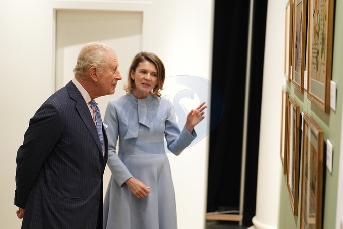King Charles III with Aura Woodward, director of the Romanian Cultural Institute in London, during a visit to view the Queen Marie of Romania exhibition at the Garrison Chapel in London. Picture date: Monday September 29, 2025., Credit:Jordan Pettitt / Avalon