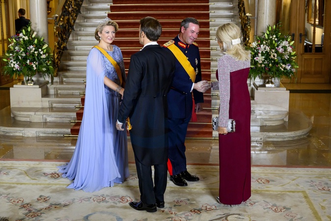 Luxemburg, The Netherlands, 2025-10-03 18:38:30LUXEMBOURG, 03-10-2025, Grand Ducal Palace Abdication of His Royal Highness Grand Duke Henri and the installation of His Royal Highness Hereditary Grand Duke Guillaume PHOTO: NLBeeld/Patrick van Emst Pictured: Grand Duke Guillaume of Luxembourg and Duchess Stéphanie with Emmanuel Macron and Brigitte Macron, Credit:Avalon