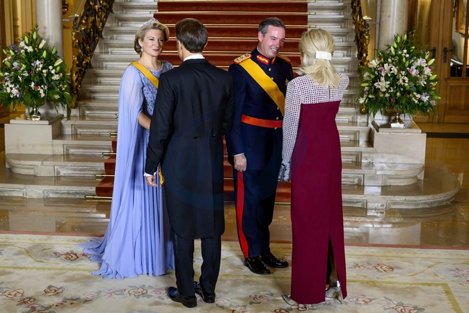 Luxemburg, The Netherlands, 2025-10-03 18:38:34LUXEMBOURG, 03-10-2025, Grand Ducal Palace Abdication of His Royal Highness Grand Duke Henri and the installation of His Royal Highness Hereditary Grand Duke Guillaume PHOTO: NLBeeld/Patrick van Emst Pictured: Grand Duke Guillaume of Luxembourg and Duchess Stéphanie with Emmanuel Macron and Brigitte Macron, Credit:Avalon