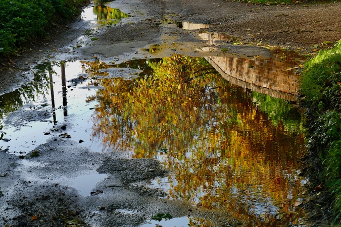 Autumnal leaves reflected in the puddles after the heavy rain., Credit:Geoffrey Swaine / Avalon