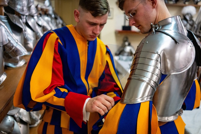 Pontifical Swiss Guards prepare ahead of their swearing-in ceremony in Vatican City, Vatican, on 04 October 2025., Credit:Stefano Costantino TTL / Avalon