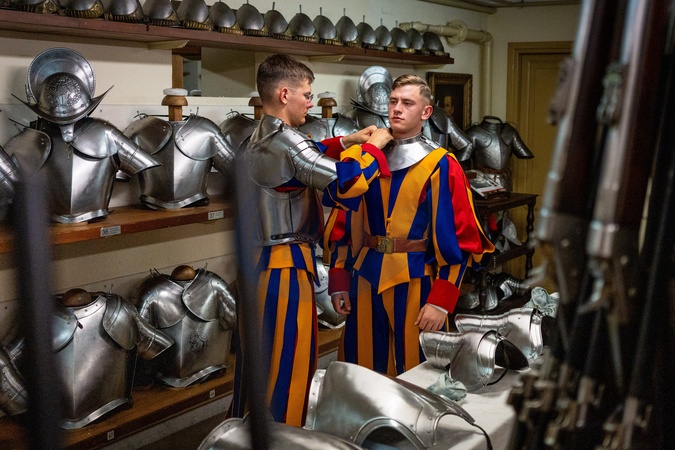 Pontifical Swiss Guards prepare ahead of their swearing-in ceremony in Vatican City, Vatican, on 04 October 2025., Credit:Stefano Costantino TTL / Avalon