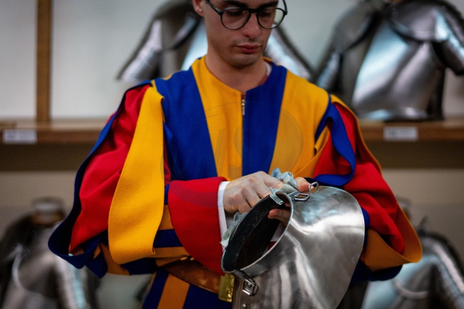 Pontifical Swiss Guards prepare ahead of their swearing-in ceremony in Vatican City, Vatican, on 04 October 2025., Credit:Stefano Costantino TTL / Avalon