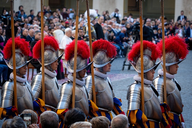 27 kadetów Papieskiej Gwardii Szwajcarskiej składa przysięgę na dziedzińcu św. Damazego w Watykanie, 4 października 2025 r.