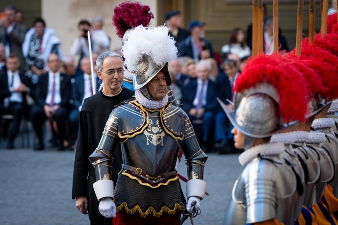 27 kadetów Papieskiej Gwardii Szwajcarskiej składa przysięgę na dziedzińcu św. Damazego w Watykanie, 4 października 2025 r.