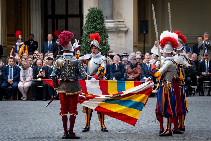 27 cadets of the Pontifical Swiss Guard pronounce the swearing-in oath in the St. Damasus Courtyard in Vatican City, Vatican, on 04 October 2025.