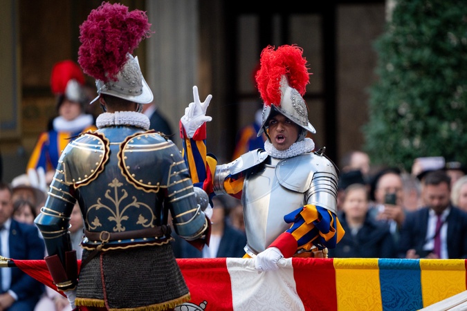 27 cadets of the Pontifical Swiss Guard pronounce the swearing-in oath in the St. Damasus Courtyard in Vatican City, Vatican, on 04 October 2025.