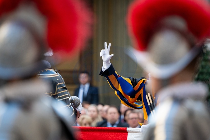 27 cadets of the Pontifical Swiss Guard pronounce the swearing-in oath in the St. Damasus Courtyard in Vatican City, Vatican, on 04 October 2025.